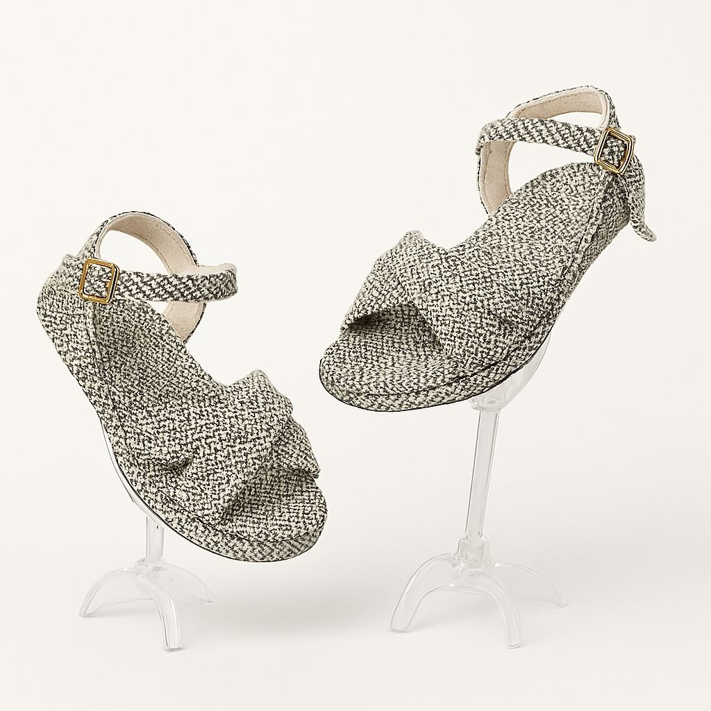 با طراحی خاص و بافت مشکیسفید، این صندلها انتخابی بینظیر برای روزهای گرم و پرتحرک هستند. بندهای ضربدری جلو و قفل طلایی دور مچ، هم جلوهای شیک به پاها میبخشند و هم باعث فیت عالی و راحتی بیشتر میشوند.